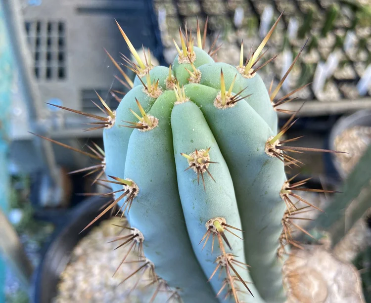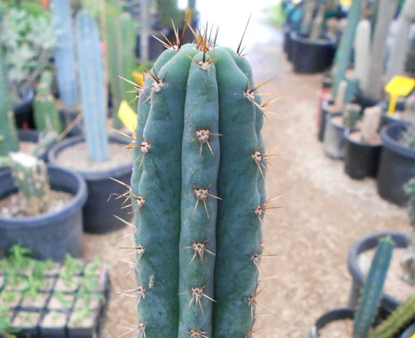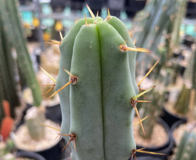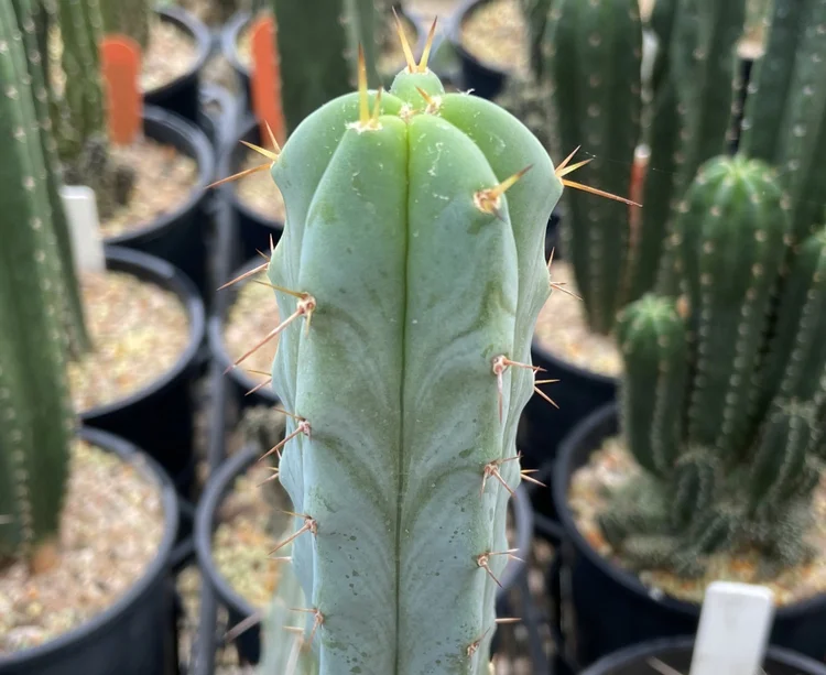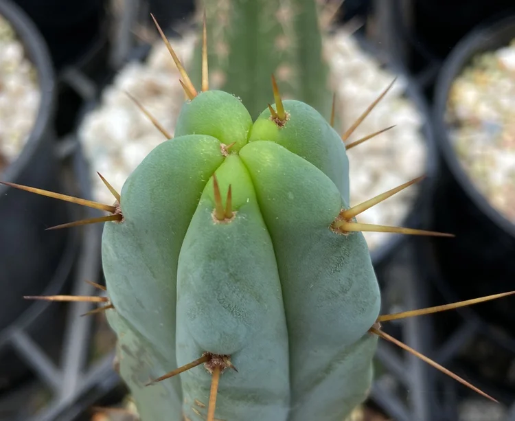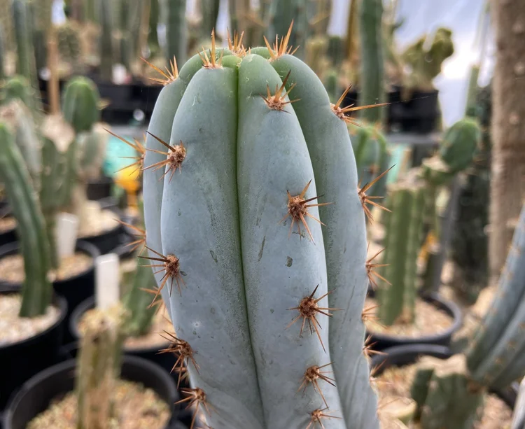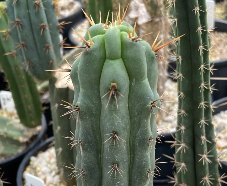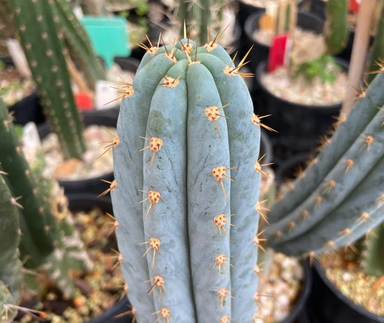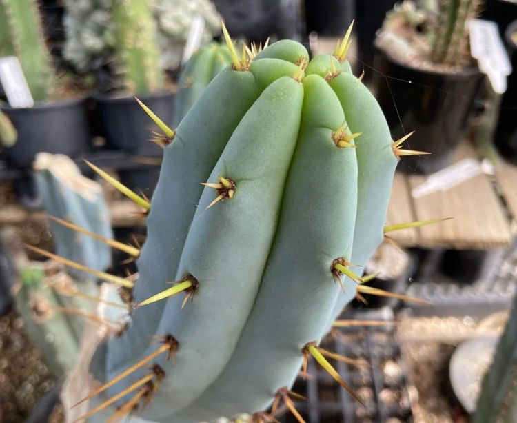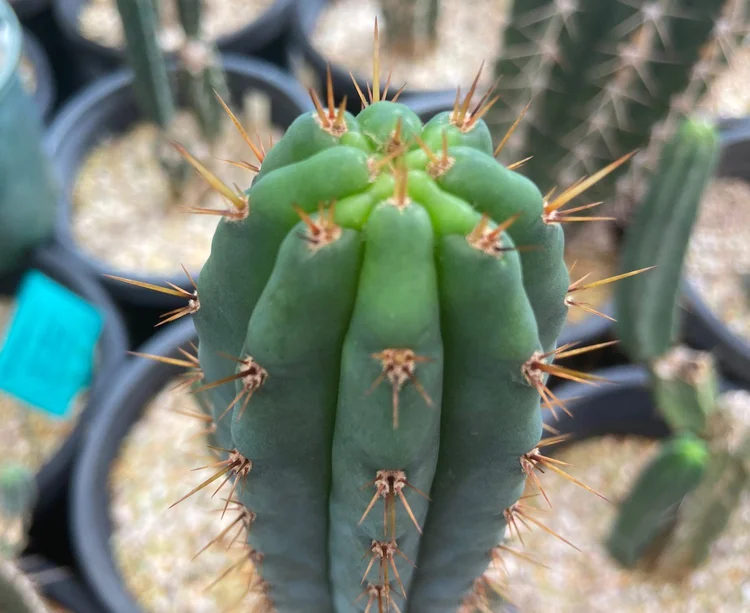 Originating from the defunct Arizona Cactus Nursery. Fat, blue, glaucous, girthy. Padded areoles, long golden spines will be your focal point. Fast growing, disease resistant.
