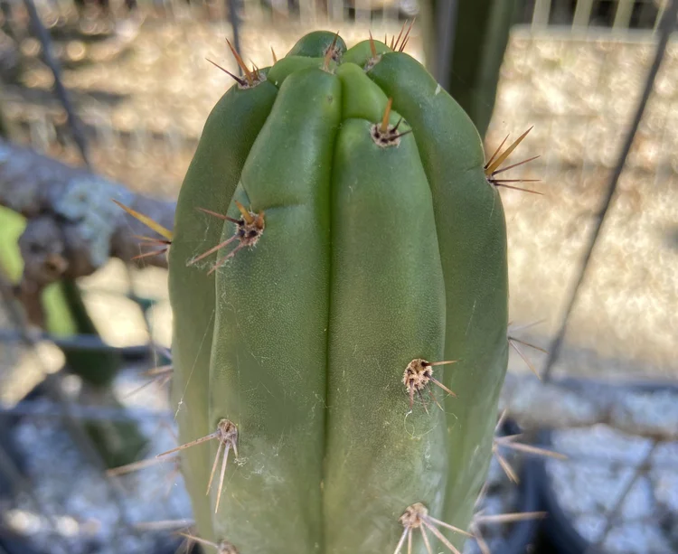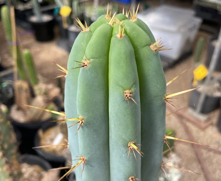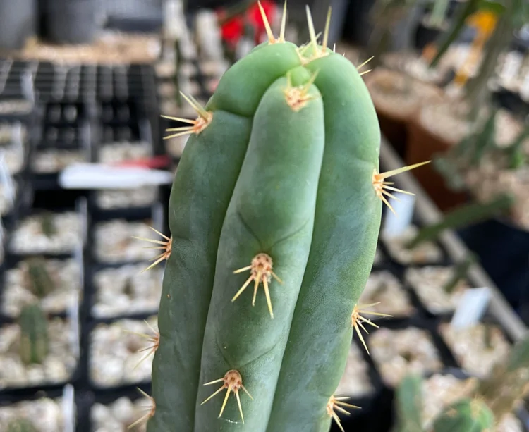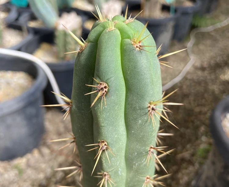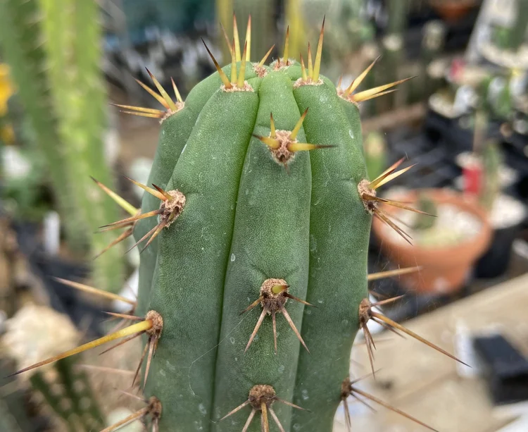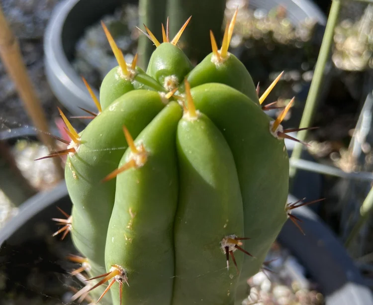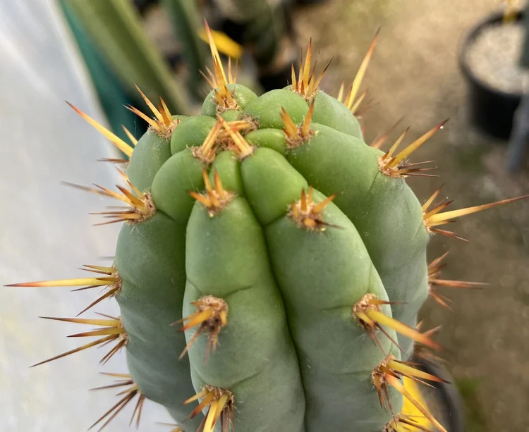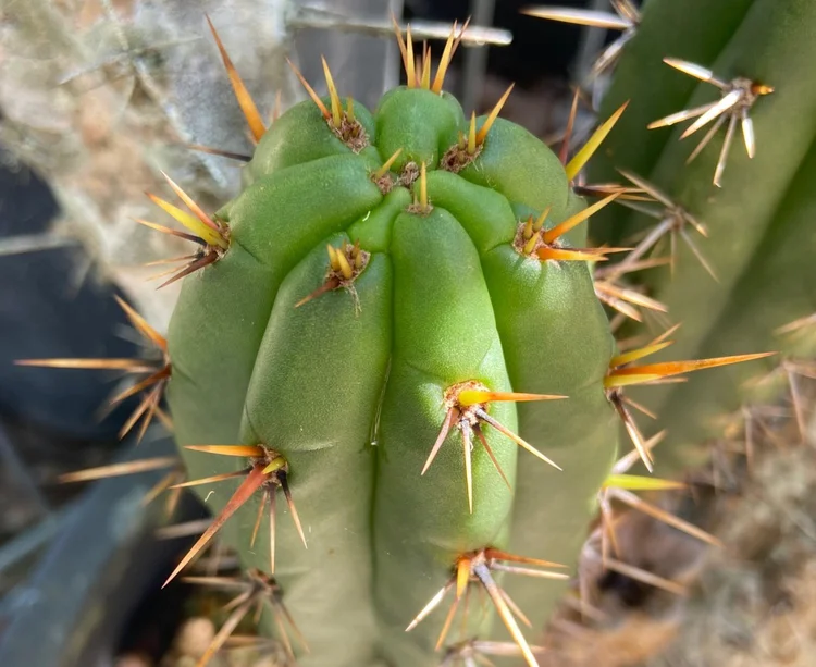 Fast growing, hardy, disease resistant. Often produces two classic Trichocereus bridgesii spines on its upper part, while each areole produces three to four spines. Strong v-notches, long, strong yellow spines with orange tips and few ribs.
