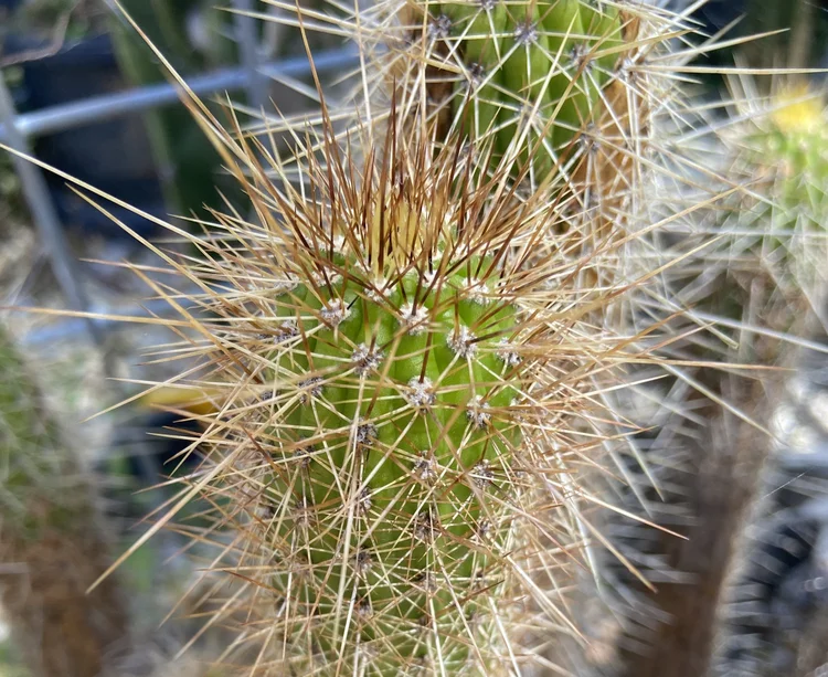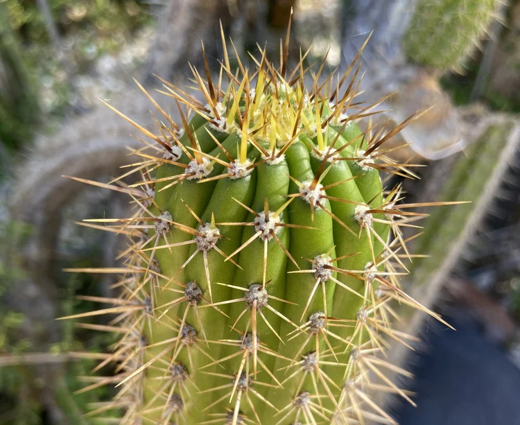 Originating from a stall called Cactus Garage at the Queen Victoria Markets, Melbourne. Green, fat, small spines turning white with age.