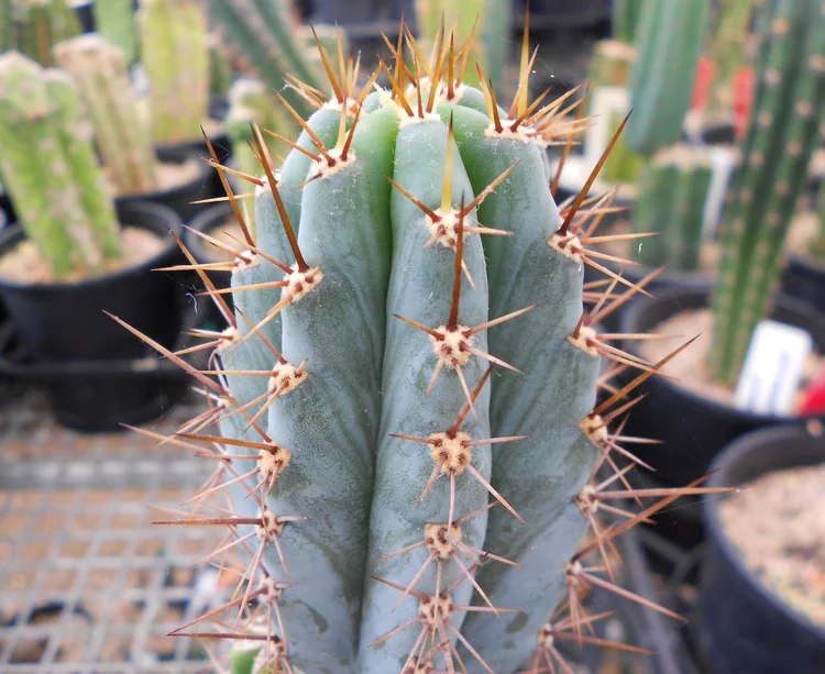 Originating from the defunct Arizona Cactus Nursery, Sydney. Frosty, blue to grey, fat, disease resistant. Large, padded areoles and golden-brown tipped spines.