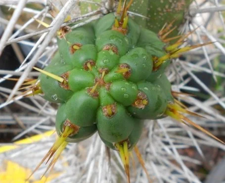 Seed collected by Karel Kníže in Tarma, Junin, west central Peru. Frosty glaucous blue to green. Large, padded areoles, protruding long top spine, honey-coloured spines.