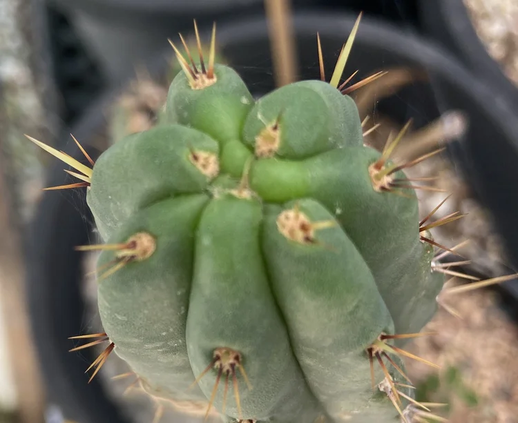 Sourced from Dawson’s by Jactus. Glaucous, large padded areoles, short golden spines.