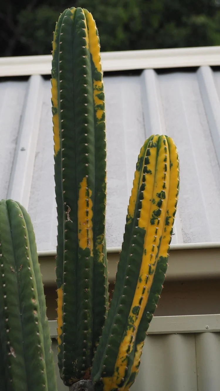 Trichocereus puquiensis X Trichocereus pachanoi. Variegated clone, very short spines.
