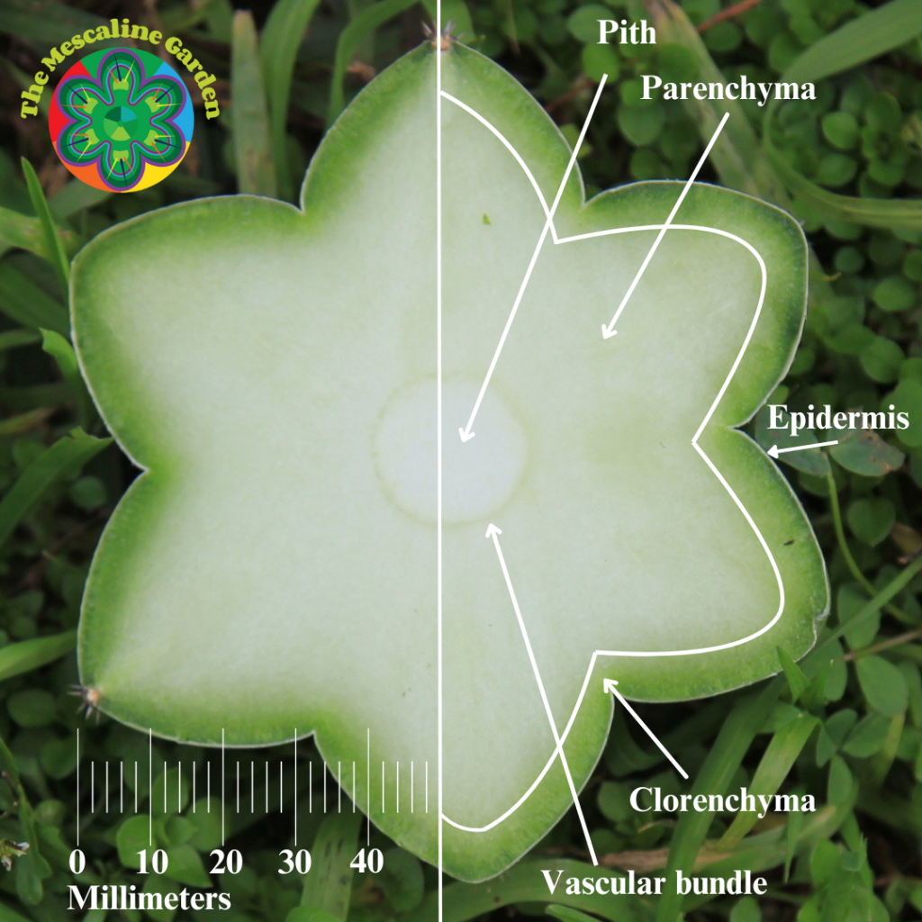Common San Pedro (Trichocereus/Echinopsis) species names you may encounter include pachanoi, peruvianus, bridgesii, macrogonus and cuzcoensis. Research quantifying mescaline potency of San Pedro is very limited and is yet to support anecdotal claims that Trichocereus bridgesii contain the greatest amount of mescaline. Research has supported claims that largest amount of mescaline (~60%) is contained in the outer green layer (cholorenchyma) of San Pedro plants, and in reduced concentrations at their growing tip.